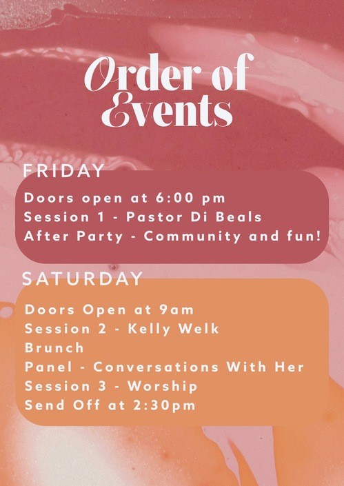 When you arrive at the conference, our Welcome Team will get you checked in, give you your name badge and a little gift. You will be able to grab a cup of coffee or tea, then find your way into our auditorium. Sessions one and two will have a few worship songs followed by a message from each of our speakers. Session three will be a time to worship, celebrate and reflect on what you've learned during our time together. Brunch will be served buffet style, there will not be an assigned place to eat, but we will have seating indoors and outdoors for you.