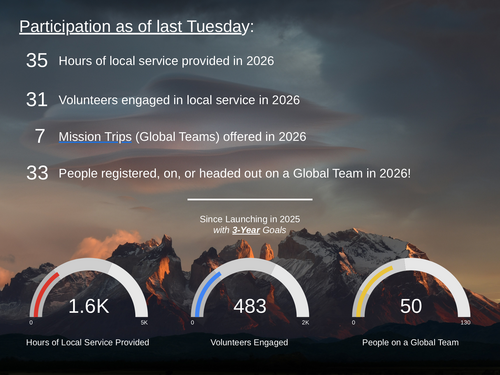 - Prayerfully and carefully choose local and global partners, teams, and opportunities aligned to our three objectives: Global Mission, Local Impact, and Future Leaders.